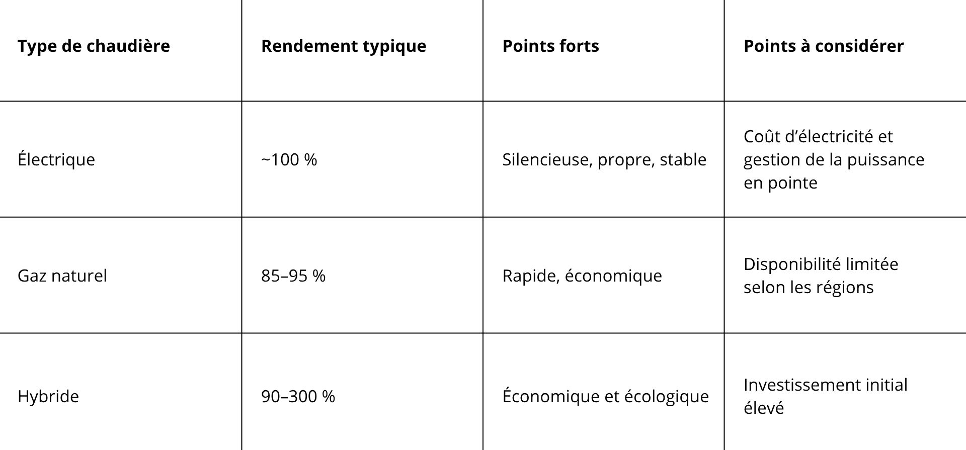 Efficacité énergétique du système de chauffage à eau chaude : Les systèmes à eau chaude sont économiques et peuvent être optimisés selon le type de chaudière utilisé : chaudière électrique, chaudière au gaz naturel ou système hybride (chaudière + thermopompe). Dans la section suivante, nous vous exposons les différents choix, leurs avantages et les limitations.